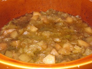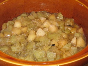 Step 1 – Peel and core apples and pears. Cut each apple slice in thirds, cut each pear slice in half. Place in slow cooker. Don’t worry about the fruit browning.