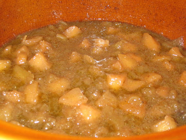 Step 5 – Pour liquid over apple and pears. Stir until mixture coats all fruit. Bury the bean pod and cinnamon sticks under the fruit.