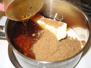 2. Combine in a large sauce pan on medium heat: sugar, butter, and evaporated milk. Heat to a rolling boil while stirring constantly. Continue to boil and stir for 3 min, then remove from heat.