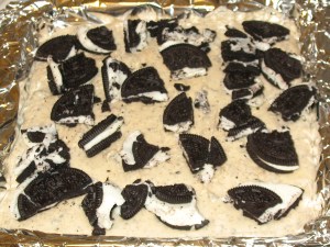 5. Sprinkle the chopped Oreos on the top, and use a butter knife to lightly swirl the cookie pieces into the fudge. You are not trying to hide the pieces entirely, just poke them down a bit, parts should stick up.