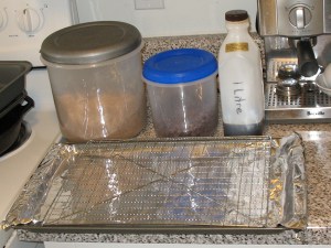 1. Pre-heat oven to 177°C / 350°F. Line the baking sheet with tin foil, and place the cooling rack on top of the sheet.