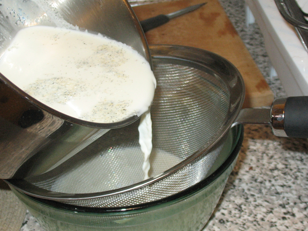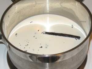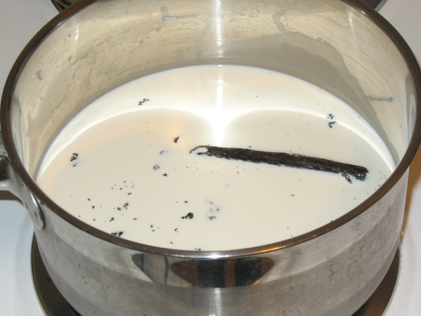 1. In a heavy-bottomed sauce pan on medium heat, combine scraped vanilla bean and the half and half. Heat to steaming.
