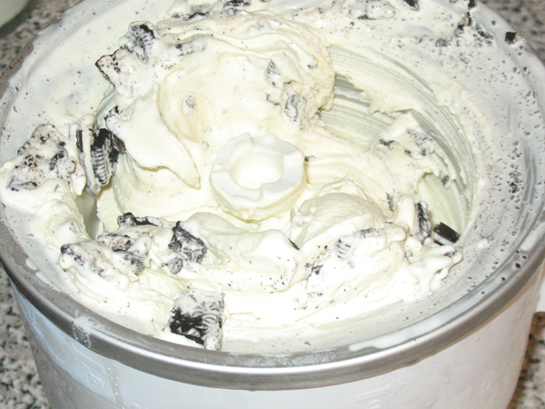 11. When you have 30 seconds left, add the Oreos. The KA recipe said to use one and half cups of chopped Oreos. That was too much, they flew out of the bowl and hit me in the face. I got Oreos and ice cream everywhere.