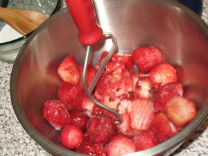 3. Crush the berries with a potato masher. Make sure you have 4½ C of crushed berries, which is not the same thing as 4½ C of berries. Very important difference!