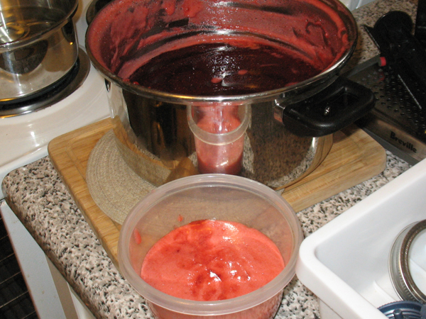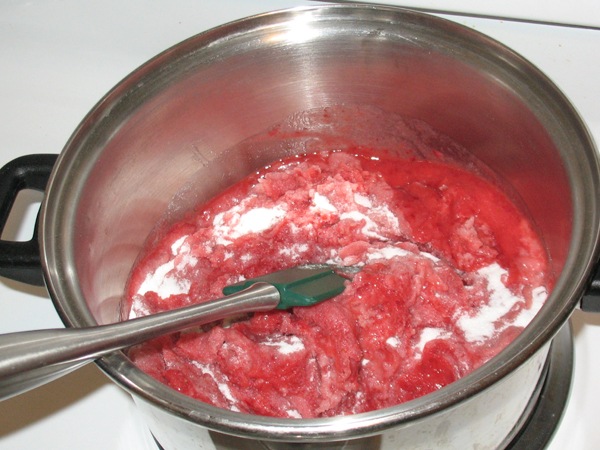 4. Transfer berries to large pot, and stir in the sugar/pectin mixture.