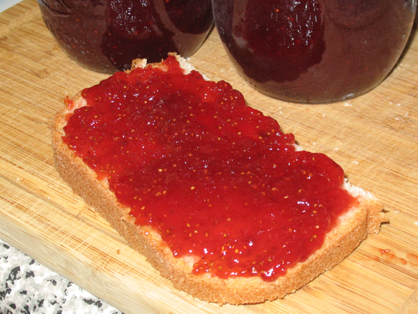 I invited a friend over recently, and she brought me a most fabulous birthday present: a canning starter kit. Wow! I was totally blown away, and very excited to make jam on my own. When Boyfriend came home and saw the canning kit, he got stars in his eyes and ran out to buy me some jars. Here is my first batch.