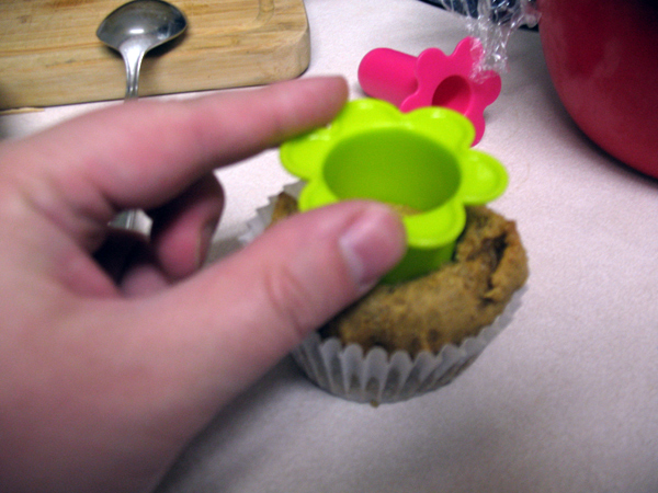 10. Use a knife to score a circle around the muffin tops and press the knife down, then lift up, and pry out the top. You will have a little muffin cone lid. Slice off the bottom part until you have a thin top remaining. Now stuff that bad boy with cream cheese and replace the top.