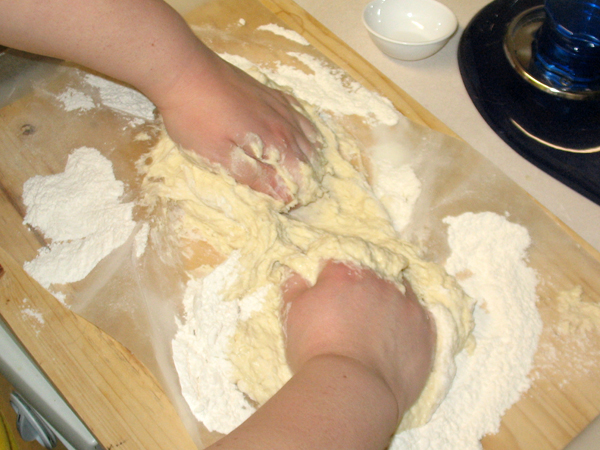 5. Turn batter onto floured surface. Get caught in the act of making mildly sorcerous hand gestures. WARNING. WARNING. Do not set wax paper on the surface. Put the flour right onto the cutting board or the counter top. Or you will be sorry.
