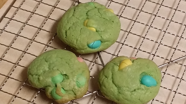 These didn’t come out quite as intended but they were delicious any way. I wanted to make Mini Egg cookies for Easter, and a test run was needed. (I was surprised how easily Boyfriend Unit accepted this flimsy excuse as justification to add a jumbo bag of Mini Eggs to the grocery list, but there you have it.) On a whim I dyed them green because I thought they would look cuter, like dino eggs in grass.