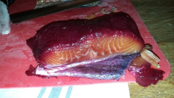 This is the gravlax Donna cured in beets and horseradish I believe. Look at how the colour stays near the top, won’t that look stunning done on white fish?