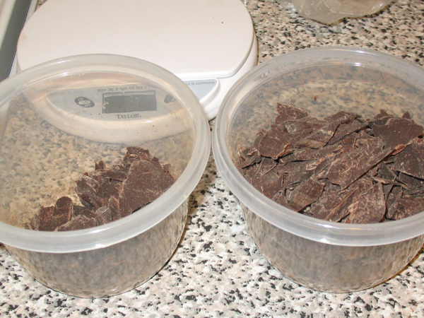I use a kitchen scale to weigh my chocolate after it’s been chopped, and divide into two bowls; Bowl A contains two-thirds of the chocolate, and Bowl B holds the last third.