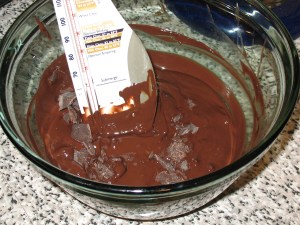 Now the chocolate is ready to be poured into moulds or whatever you have planned to do. It will continue to cool, if you find it is becoming too hard to work with, repeat step 3.