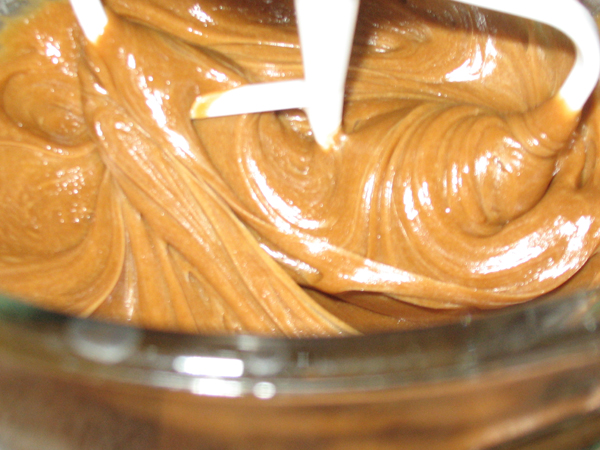 A few minutes later it will start to look this this. Do you see how the fudge is no longer completely covering the beater as it’s in motion? The fudge is starting to look stretched.