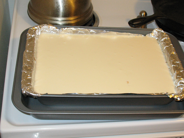 Now with a springform pan, it must be wrapped in heavy tinfoil so the water doesn’t touch the cheesecake: