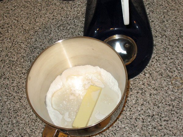 4. Add butter and remaining milk. Beat on Low until combined, and then beat on Medium for 90 seconds.