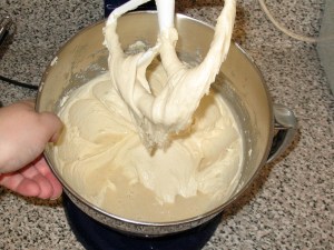 7. Make your frosting by combining the cream cheese, butter, milk, lemon juice, and vanilla. Beat well, and add the icing sugar one cup at a time. Beat until smooth.