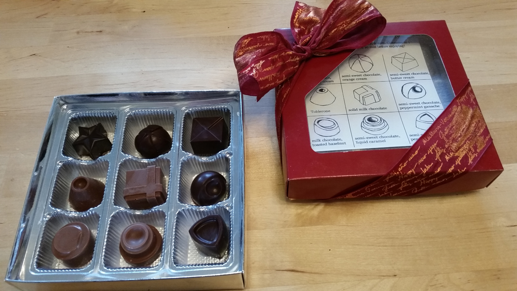 - boxes (1/2 lb square Bordeaux stripes) ordered from Chocolat-Chocolat Inc based in Montreal QC, product # cc202-3